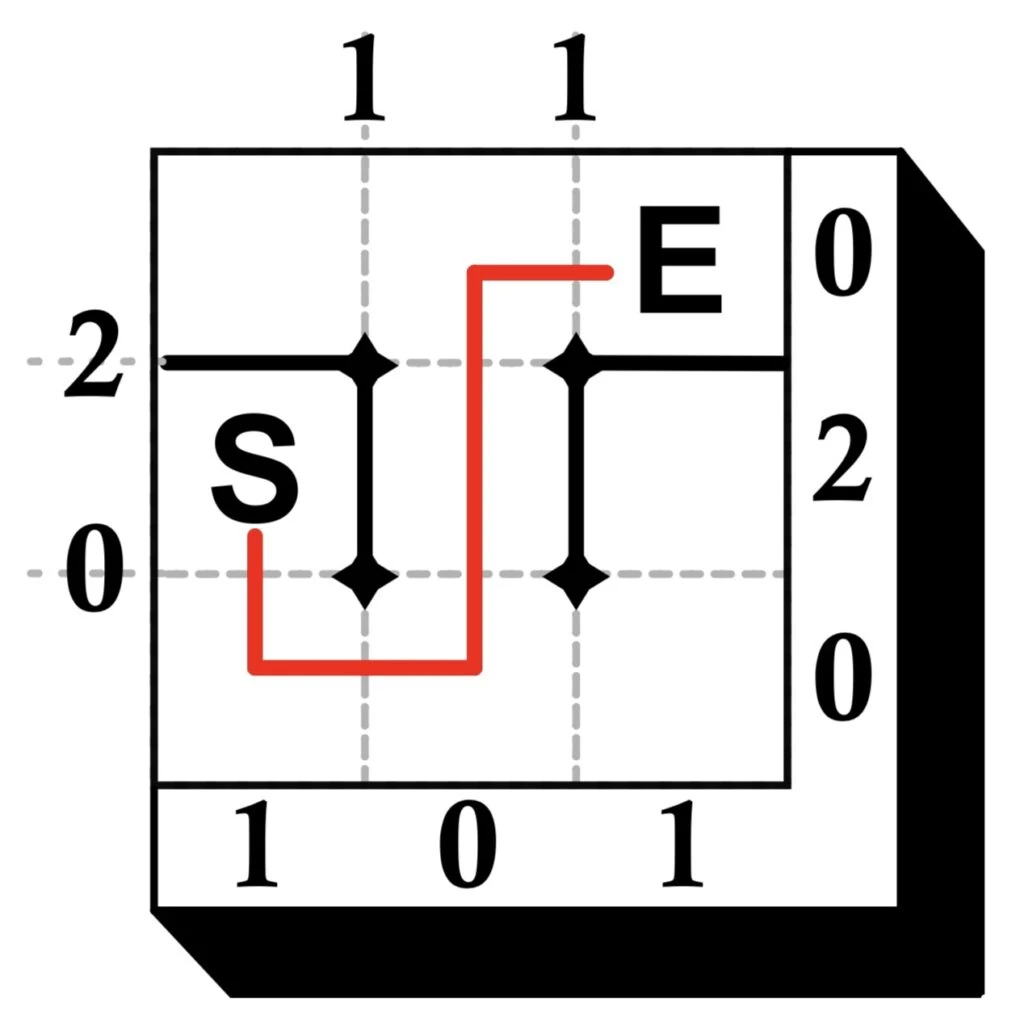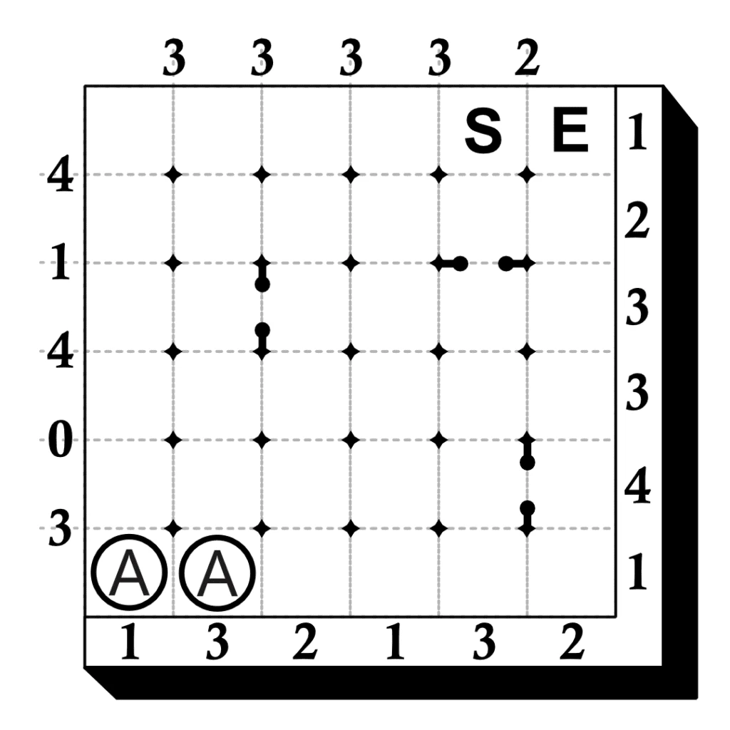 The walls of the maze are to be drawn on the dotted lines inside the border. A single wall exists either between 2 nodes or a node and the border. The numbers on the top and left of the border tell you how many walls exist on the corresponding lines inside the grid. The numbers on the right and bottom of the border tell you how many walls exist in the corresponding rows and columns. In addition, the following must be true: