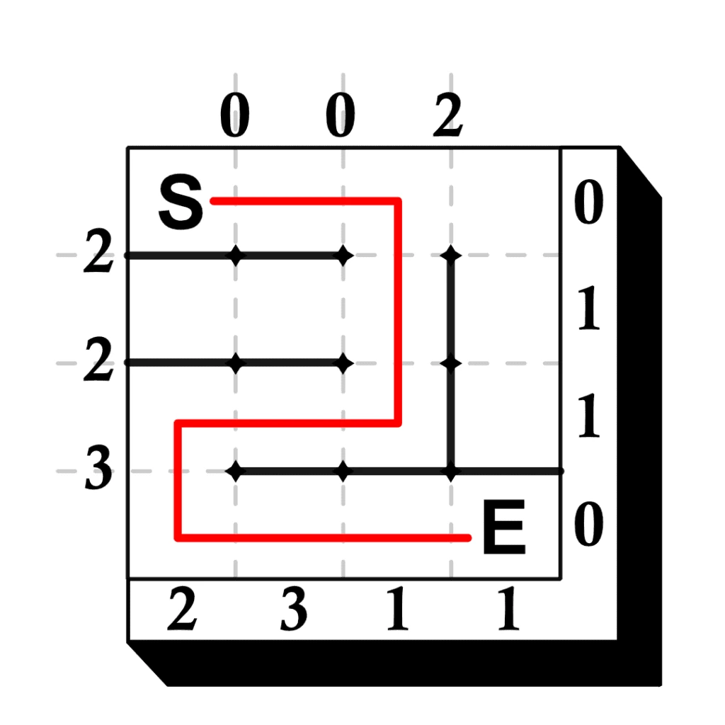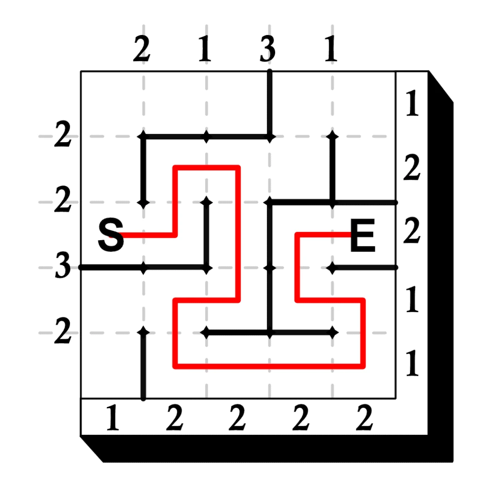 The walls of the maze are to be drawn on the dotted lines inside the border. A single wall exists either between 2 nodes or a node and the border. The numbers on the top and left of the border tell you how many walls exist on the corresponding lines inside the grid. The numbers on the right and bottom of the border tell you how many walls exist in the corresponding rows and columns. In addition, the following must be true: