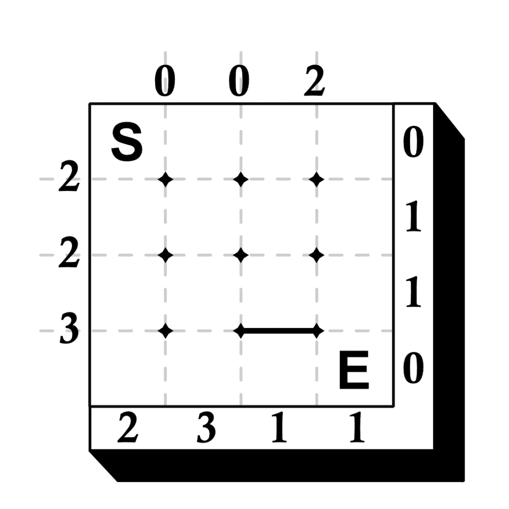 The main challenge of a Sunome puzzle is drawing a maze. Numbers surrounding the outside of the maze border give an indication of how the maze is to be constructed. To solve the puzzle you must draw all the walls where they belong and then draw a path from the Start square to the End square.