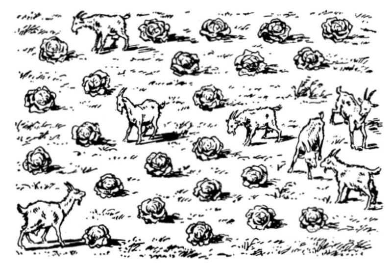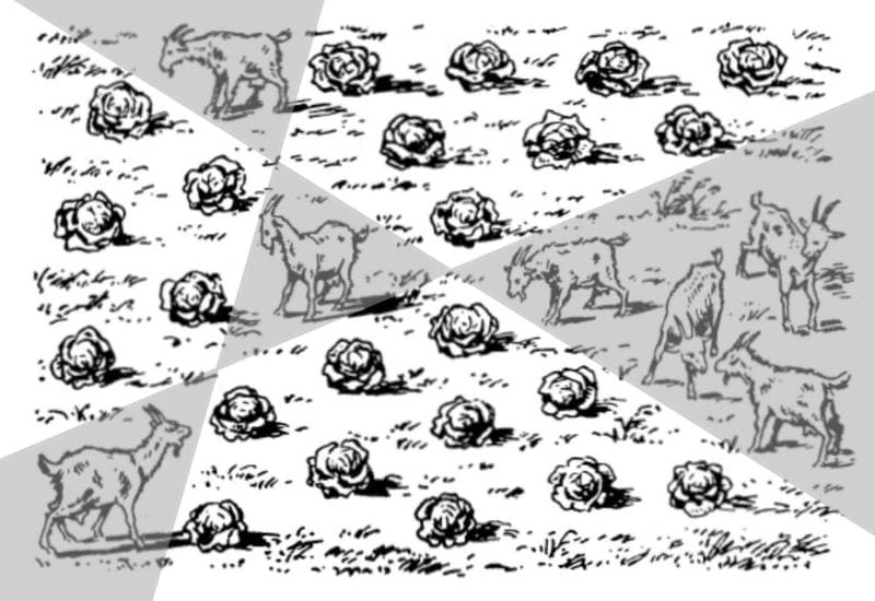 Separate all the goats from the cabbage in the picture by drawing 3 straight lines.