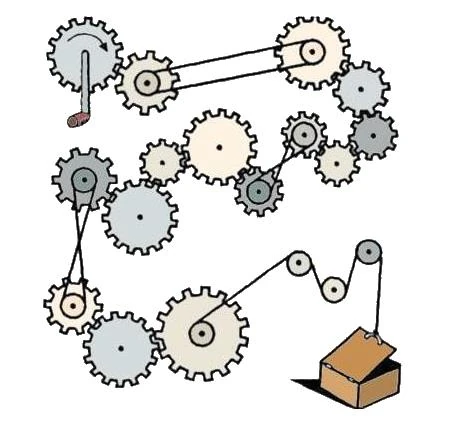 If you turn the handle of the top left gear clockwise, will the box in the bottom right open or close?
