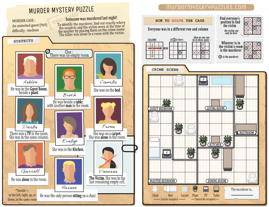 In the three murder cases below, you can read the testimonies of all suspects. For each case, find who the killer is, knowing that no 2 people are in the same row or column, and that the killer was alone in a room with the victim.