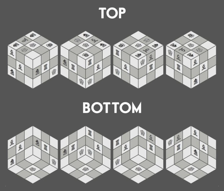 Last week we found out that Puzzle Pranks Co. have invented a new type of puzzle β Rubikβs Chess. The goal is simple β you get a scrambled cube with various chess pieces on its sides, and you must unscramble it so that on each side there is one mated King, assuming the kings cannot capture the neighboring pieces (Queens, Rooks, Bishops, kNights).