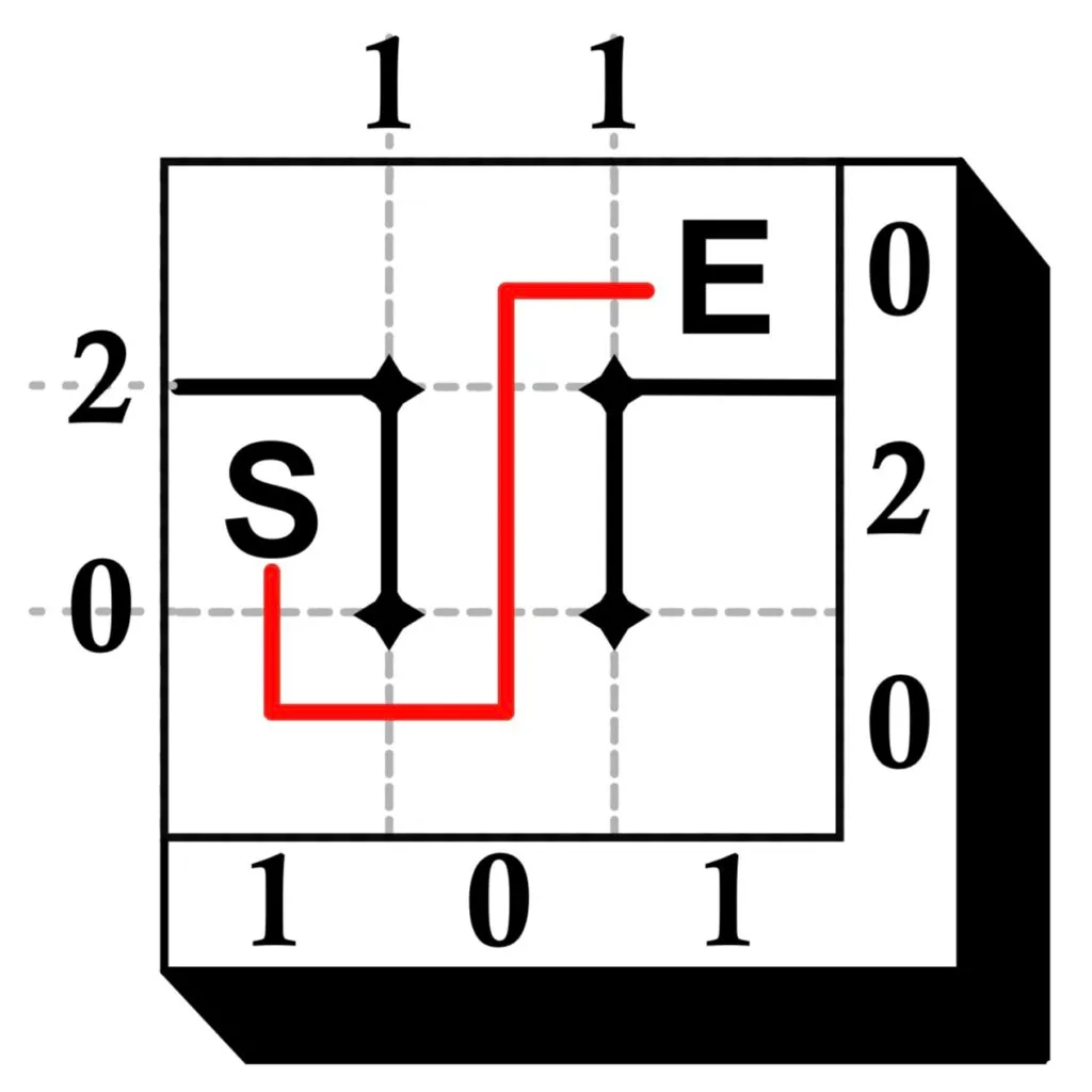 The walls of the maze are to be drawn on the dotted lines inside the border. A single wall exists either between 2 nodes or a node and the border. The numbers on the top and left of the border tell you how many walls exist on the corresponding lines inside the grid. The numbers on the right and bottom of the border tell you how many walls exist in the corresponding rows and columns. In addition, the following must be true: