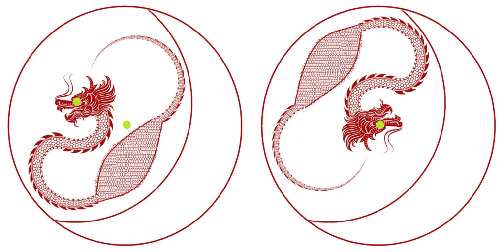Divide the circle below in two pieces. Then, put the pieces together to get a circle with a dragon, such that the dragonβs eye is at the center of the new circle.