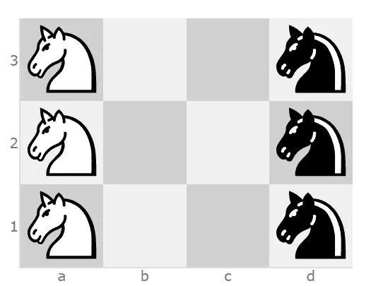 Your goal is to switch the positions of the three white knights with the positions of the three black knights. What is the least number of moves required to do this?