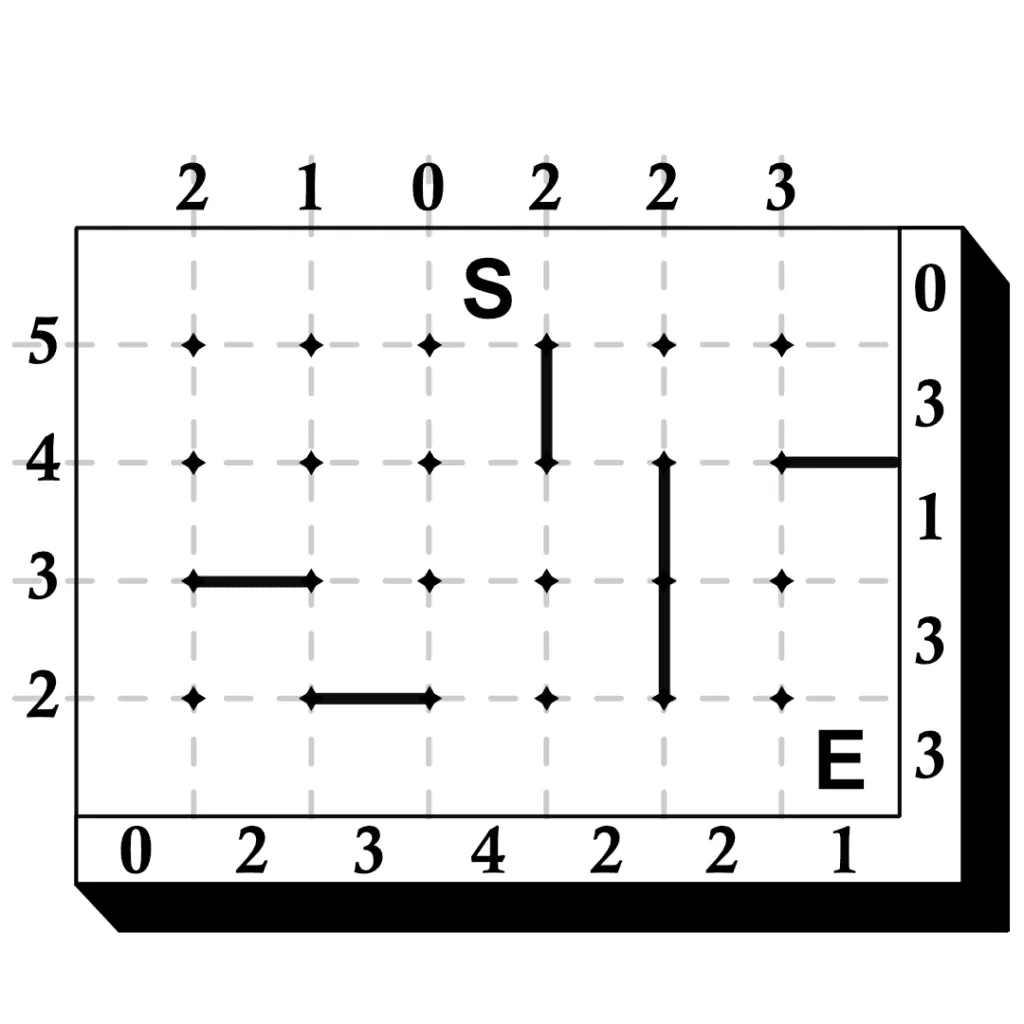 The walls of the maze are to be drawn on the dotted lines inside the border. A single wall exists either between 2 nodes or a node and the border. The numbers on the top and left of the border tell you how many walls exist on the corresponding lines inside the grid. The numbers on the right and bottom of the border tell you how many walls exist in the corresponding rows and columns. In addition, the following must be true: