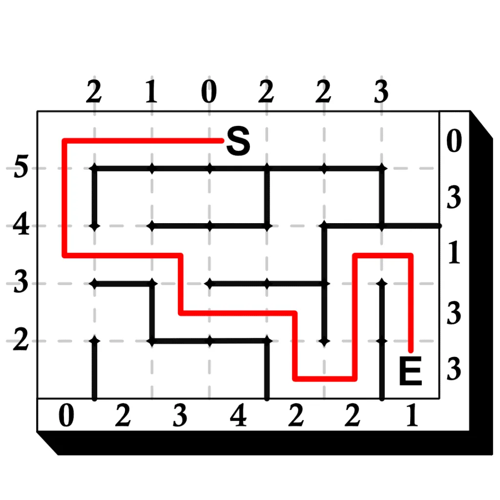 The main challenge of a Sunome puzzle is drawing a maze. Numbers surrounding the outside of the maze border give an indication of how the maze is to be constructed. To solve the puzzle you must draw all the walls where they belong and then draw a path from the Start square to the End square.