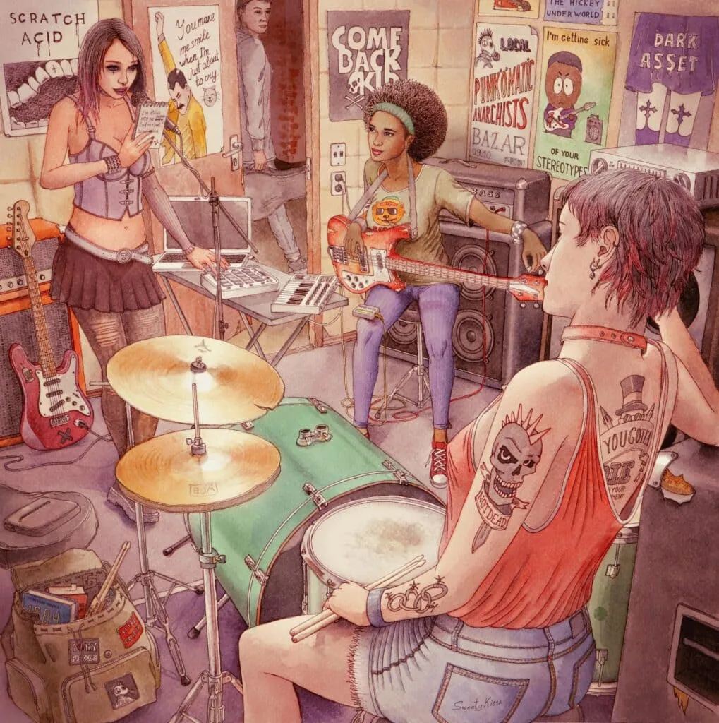What are the names of the three girls in this rock band?