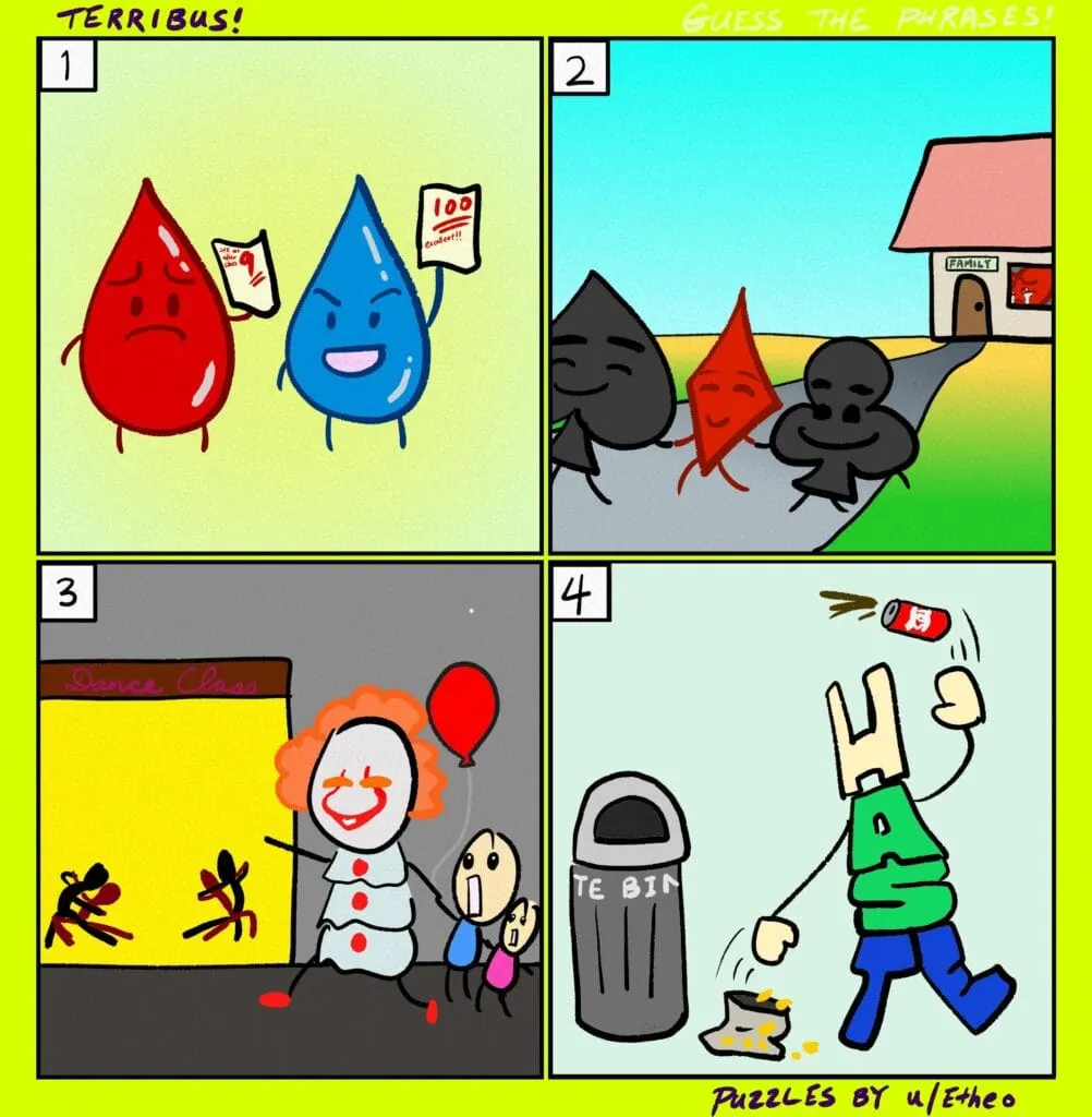 Recognize the phrases depicted by the “terrible rebuses” below.