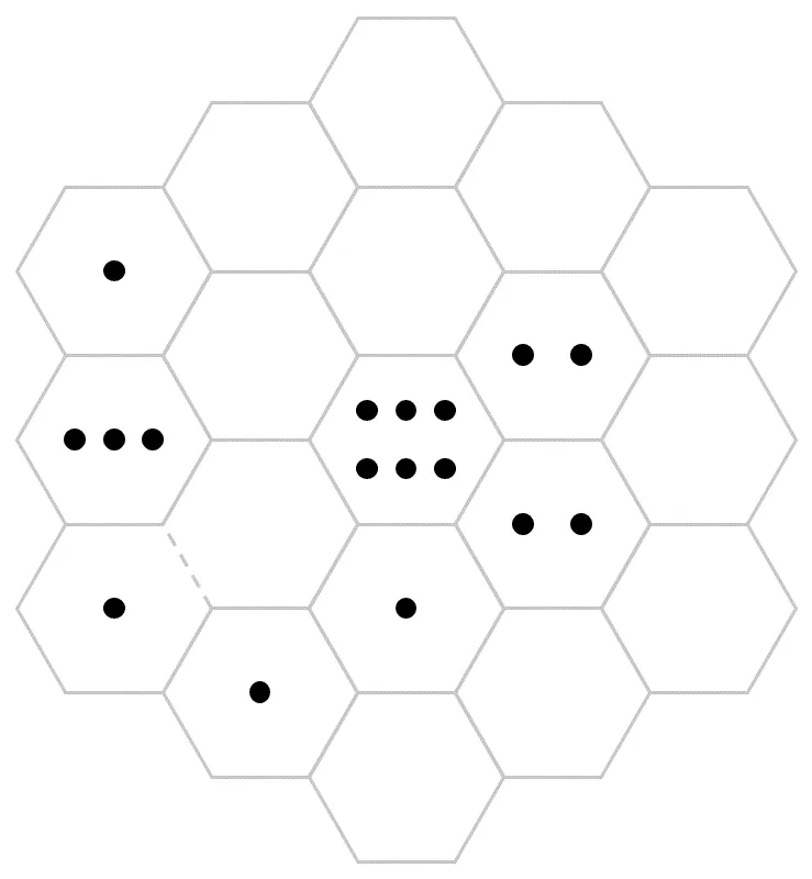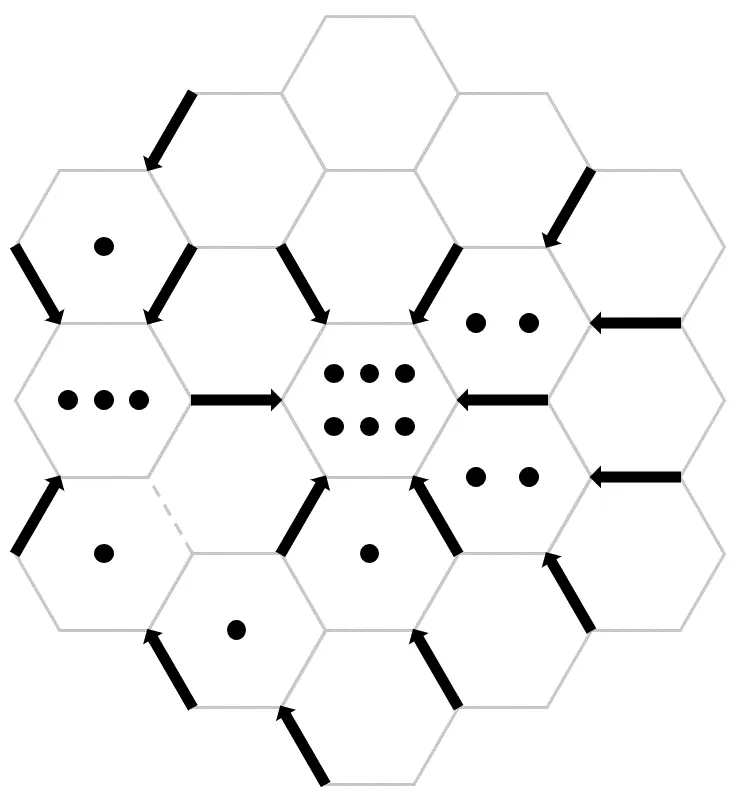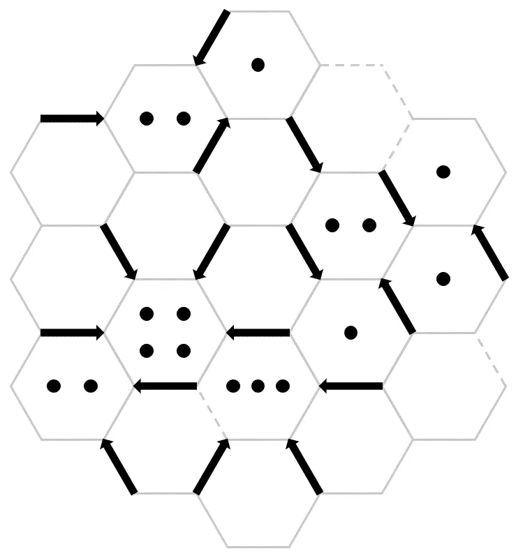 Place arrows along the hexagon edges so that the number of arrows pointing to each hexagon equals the number of dots inside, adhering to the following rules:
