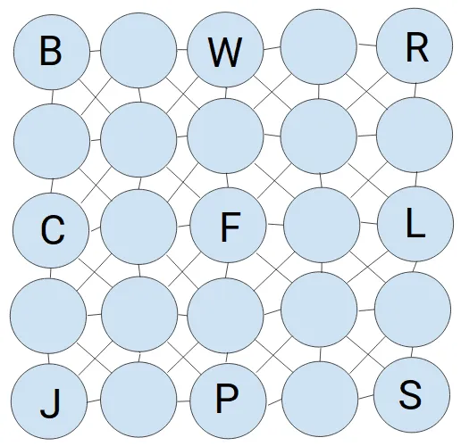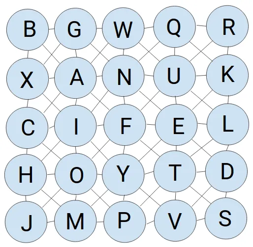 Add the 25 letters between A and Y to the grid below. Each one should appear exactly once. When you have finished, you must be able to spell the following words moving horizontally, vertically or diagonally around the grid: