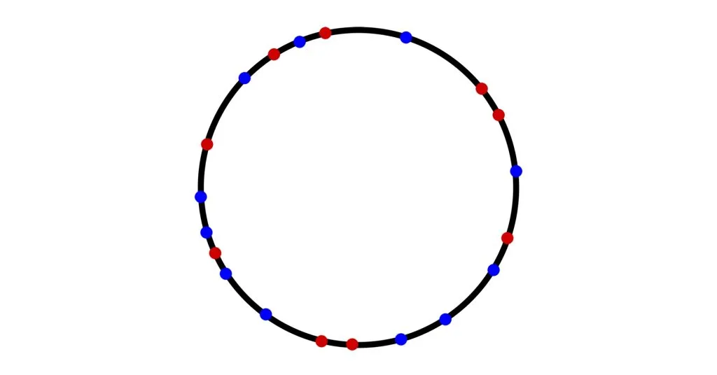 All points on a circle are colored in blue and red colors. Show that you can inscribe inside the circle an isosceles triangle whose vertices have the same color.